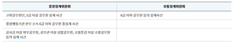 중앙징계위원회와 보통징계위원회로 나누어지는데요, 고위공무원단과 5급 이상 공무원의 징계 사건은 중앙징계위원회 관할이 되고, 6급이하 공무원의 징계사건은 보통징계위원회가 맡게 됩니다. 법관이나 검사, 경찰 등 특정분야의 공무원에 대해서는 별도의 징계위원회를 설치 운영하고 있습니다.