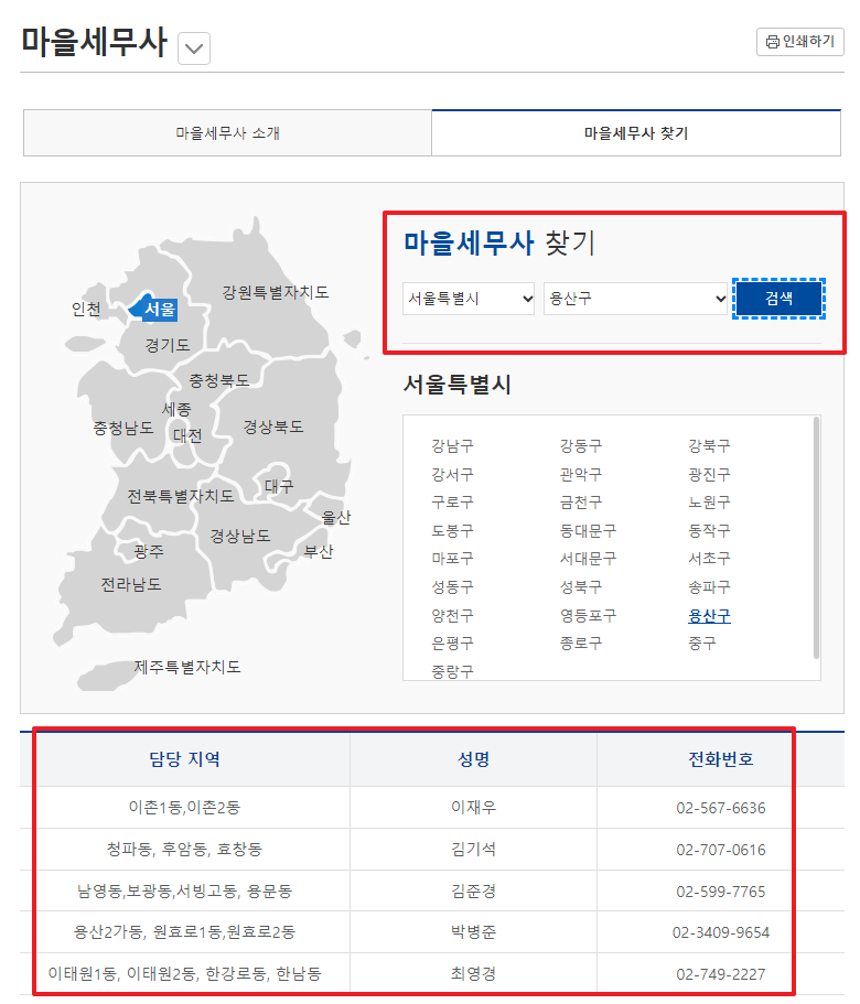 👉 아래 마을세무사 찾기를 통해서 자신의 주거지역을 선택하고 검색을 누르면, 해당지역의 세무사들의 전화번를 확인하실 수 있습니다.