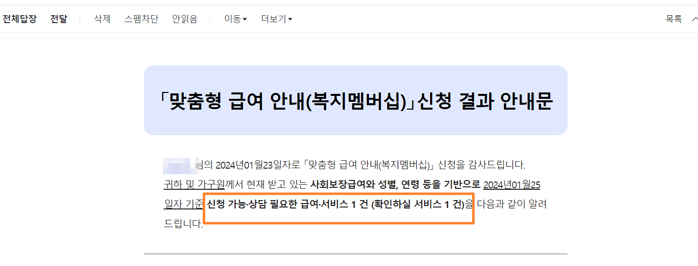 복지멤버십 신청을 하시면 아래 메일에 보이시는거와 같이 본인에게 필요한 복지제도를 신속하게 안내해 주고 있습니다.