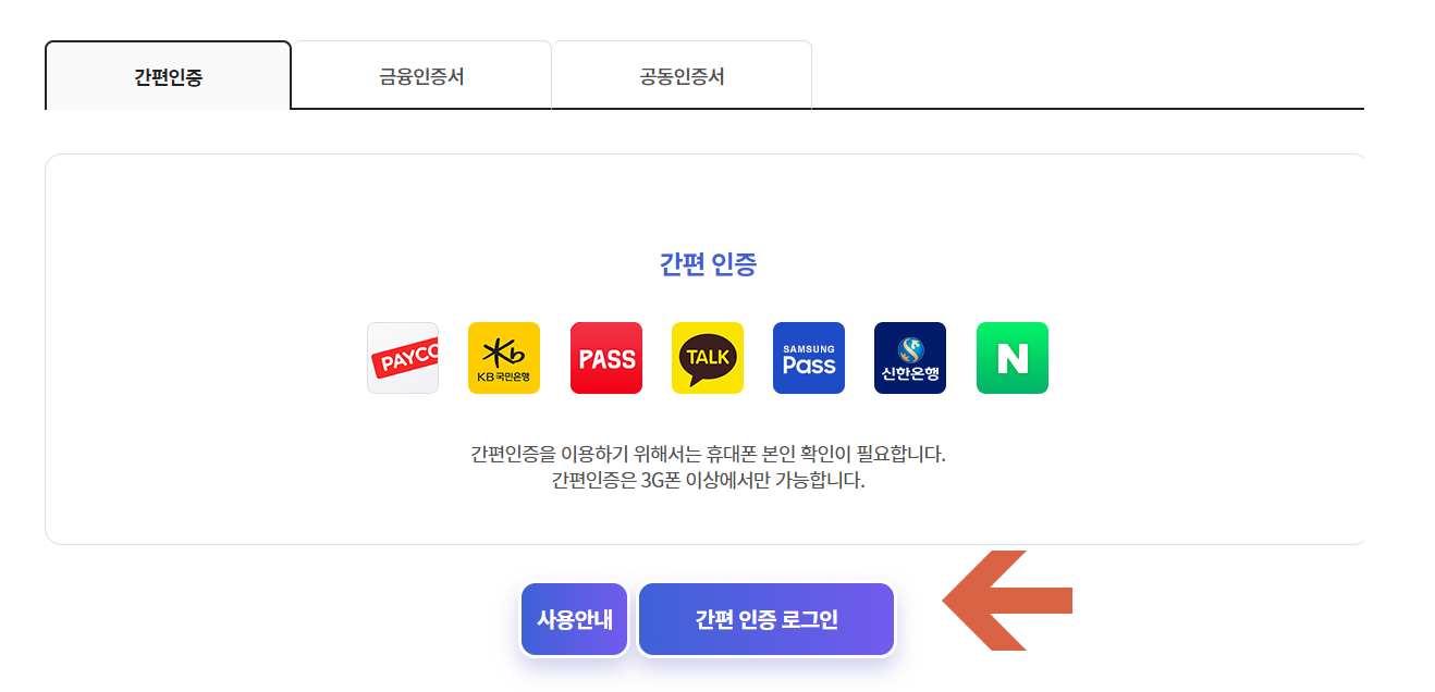 ② 간편 인증, 금융인증서 등 선택하여 본인인증