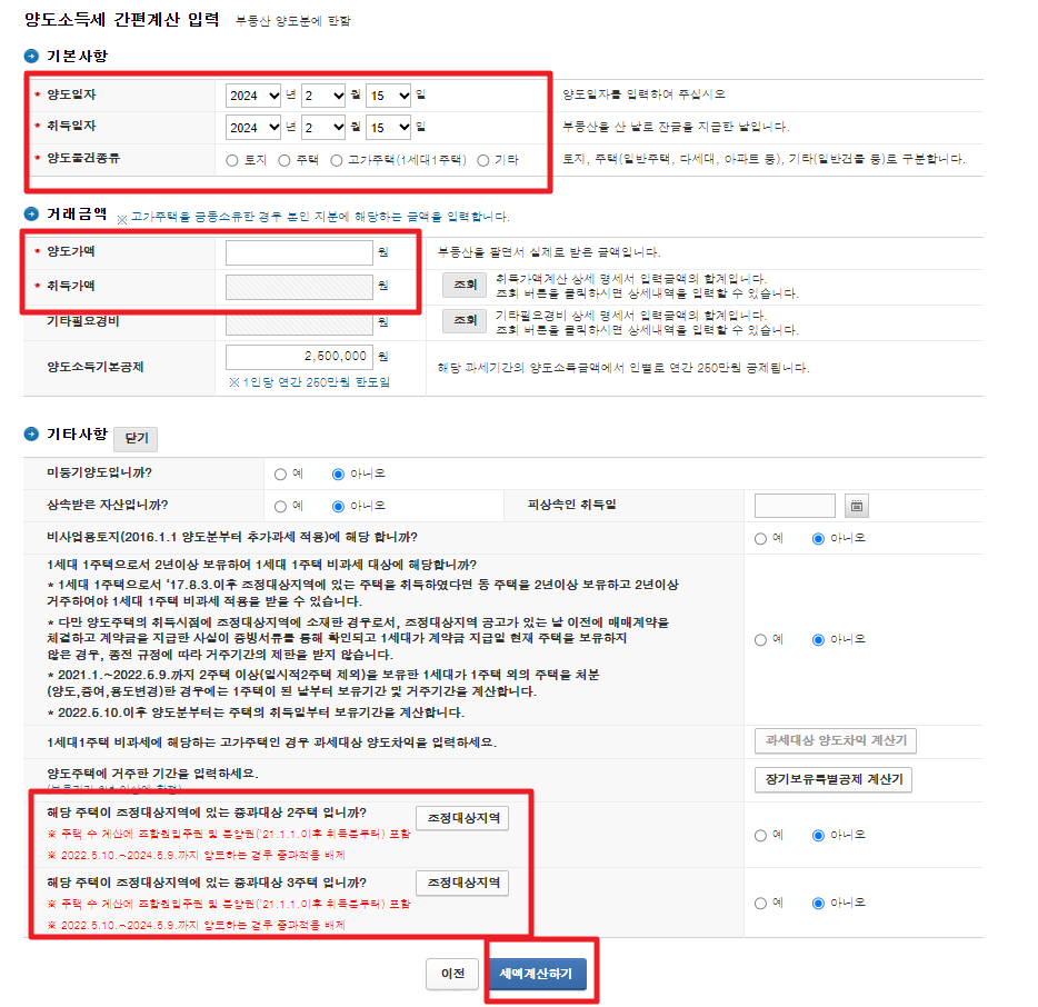 ※ 양도일자, 취득일자 등 기본사항과 해당주택(부동산의 경우)이 조정대상지역인지 여부 체크 등을 통해 세액을 계산해 볼 수 있습니다.