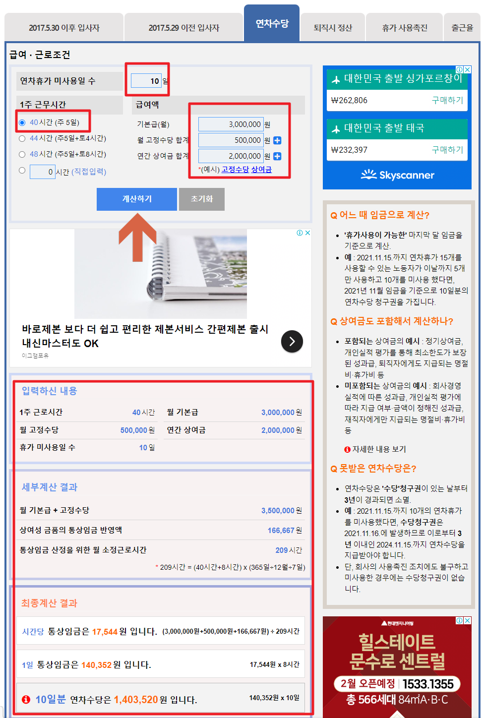 아래 그림은 연차수당 계산기에서 계산해본 예시입니다.