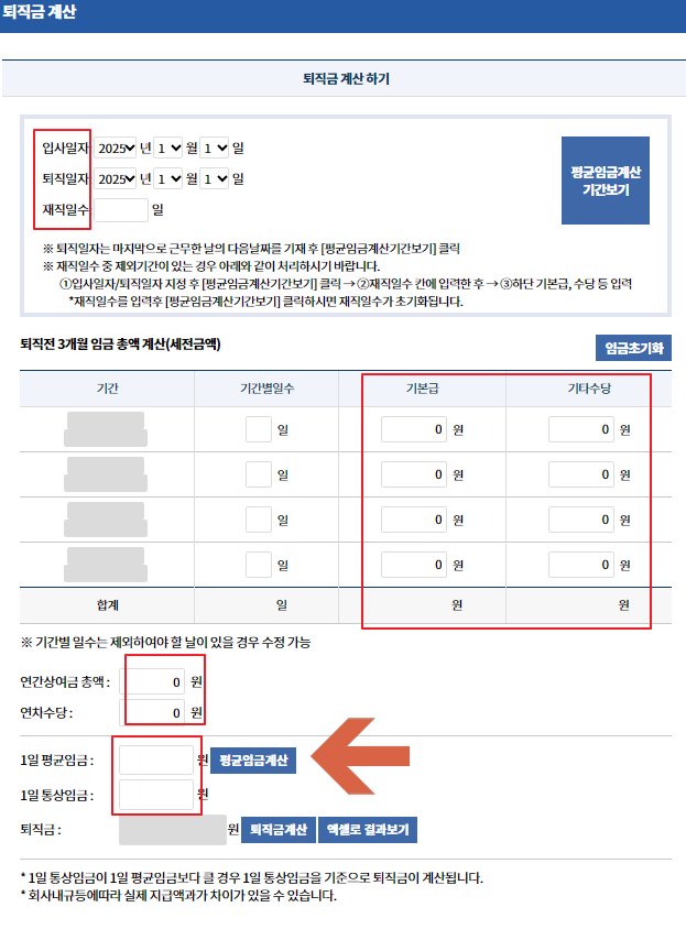 *재직일수를 입력후 [평균임금계산기 간 보기] 클릭하시면 재직일수가 초기화가 됩니다.