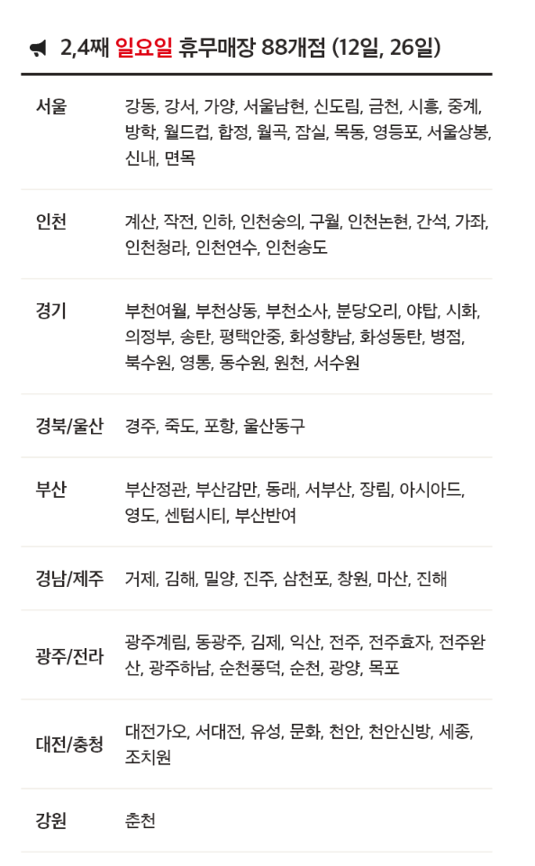 👉 둘째.넷째 일요일 휴무매장 88개점