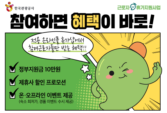 근로자의 여행경비40만원을 지원하는 사업이 있다는 것을 알고 계신가요? 근로자 휴가지원사업은 직장 내 자유로운 휴가 문화 조성과 국내여행 활성화를 위해정부와 기업이 함께 근로자의 국내여행 경비(휴가비)를 지원하는 사업입니다.